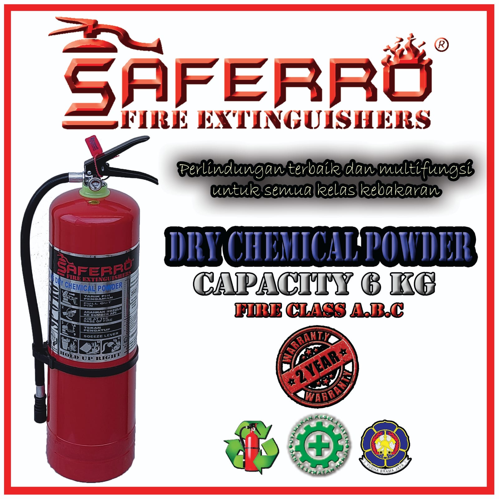 Kami memberikan jaminan kualitas APAR dengan garansi tekanan dalam tabung 2 tahun selama segel masih utuh. Selain itu APAR SAFERRO memiliki masa expired media hingga 2 tahun. Tabung Pemadam / APAR SAFERRO memiliki Izin Rekomendasi Dinas Damkar Kota Bekasi No: 671.1/12/BAPL-PP/DAMKAR/III/2016